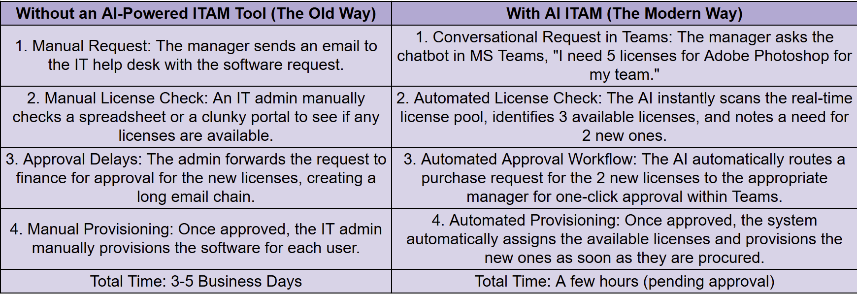 To understand the real-world impact, let's compare a common ITAM task performed with and without a modern AI-powered tool.