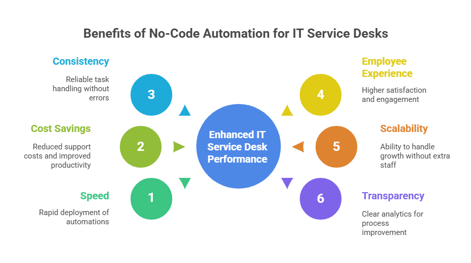 IT teams traditionally rely on scripts and manual procedures. Automating these processes with no‑code delivers multiple advantages: