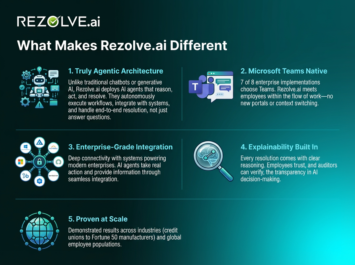 Microsoft Teams Native: With 7 of 8 enterprise implementations choosing Microsoft Teams as their primary support channel, Rezolve.ai meets employees where they already work. No new portals to learn, no context switching—just conversational support within the flow of work.