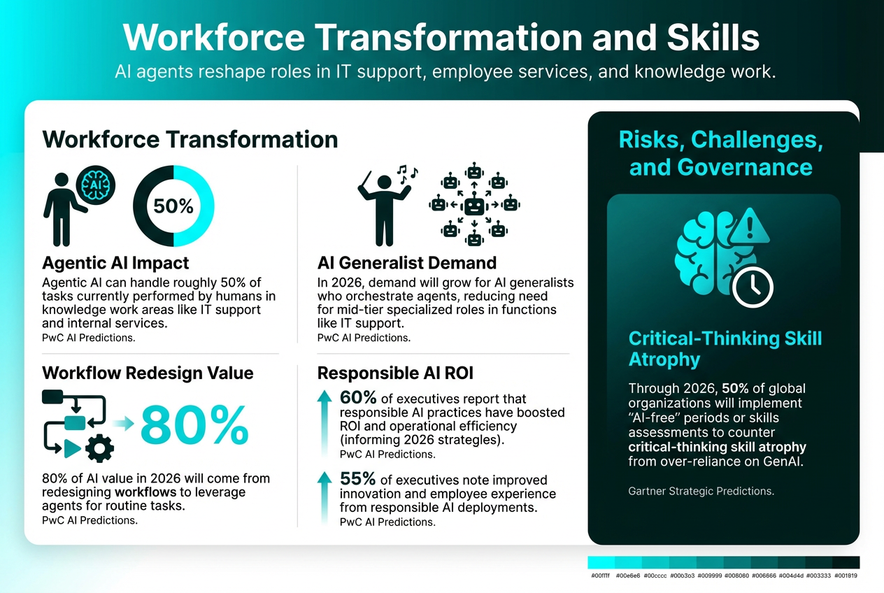 - In 2026, demand will grow for AI generalists who orchestrate agents, reducing need for mid-tier specialized roles in functions like IT support. PwC AI Predictions