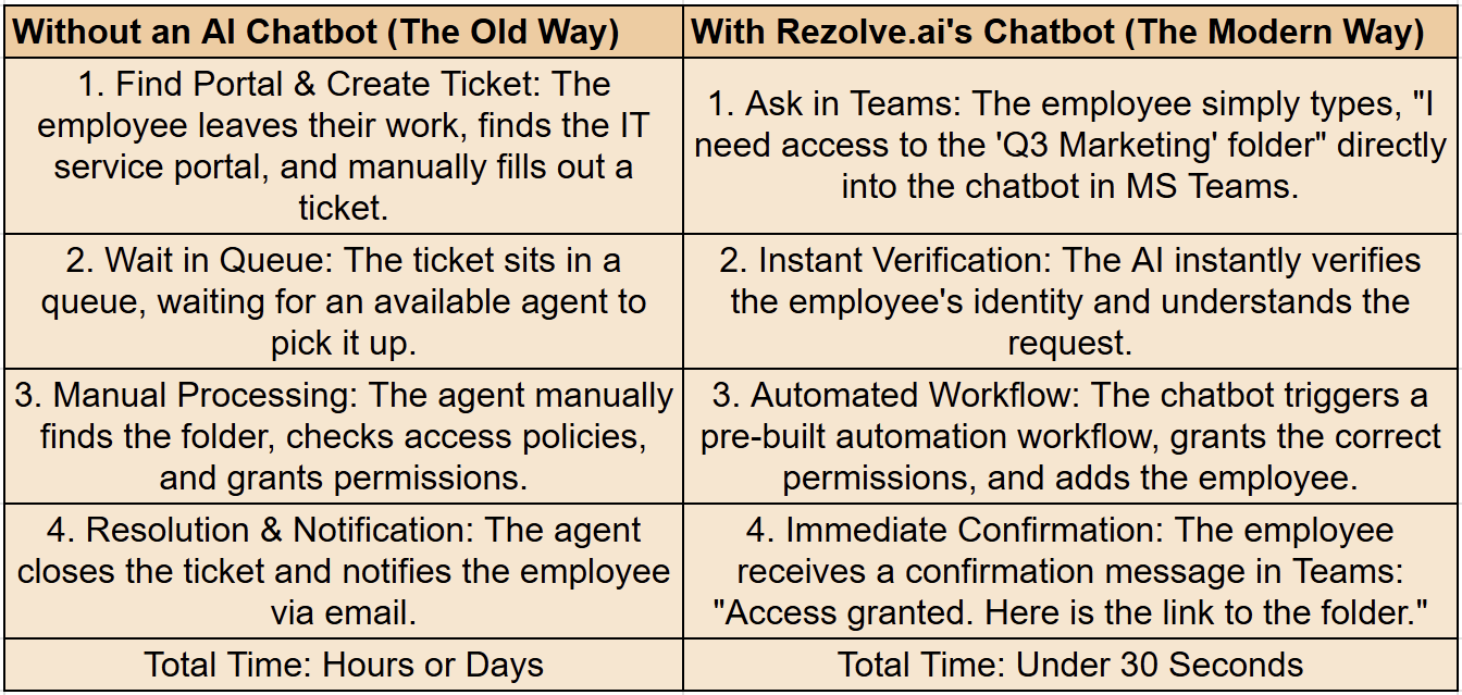 To understand the real-world difference, let's compare a common support scenario with and without a modern AI chatbot like Rezolve.ai.