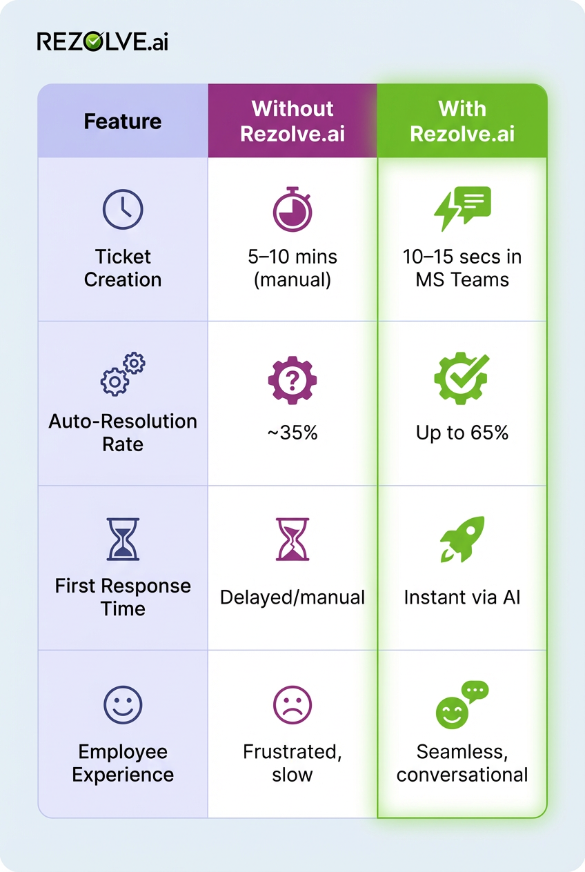 Rezolve.ai isn't just a ticketing system; it is an Agentic AITSM platform purpose-built for Microsoft Teams. Unlike traditional tools that just "log" tickets, Rezolve.ai uses GenAI to resolve them instantly. It acts as a "sidekick" for your employees, understanding context and executing workflows (like software installation or user onboarding) without human intervention.
