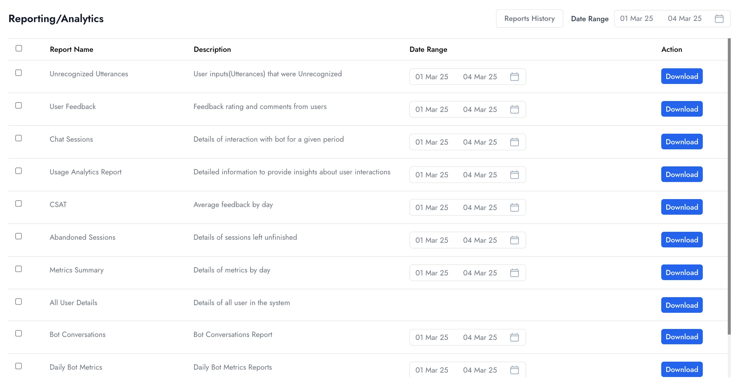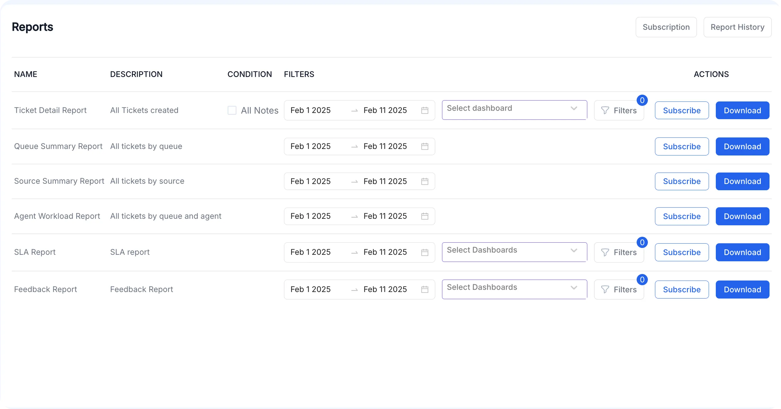 This module allows admins to access, generate, and download out-of-the-box reports for their tickets, SLAs, IT Service Delivery, and resolution success rate.