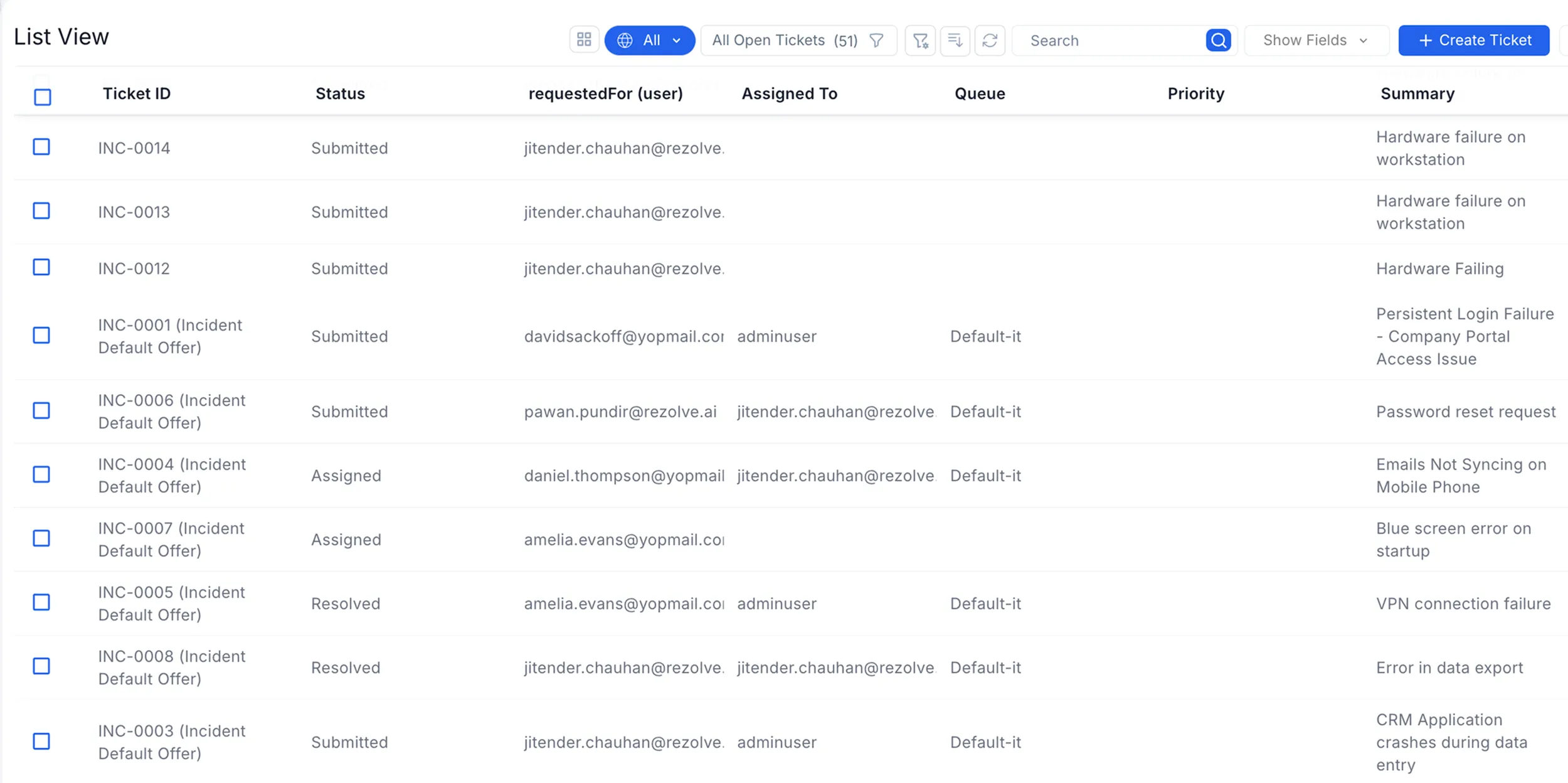 List view off all tickets. Check out next module 'Service Catalog'